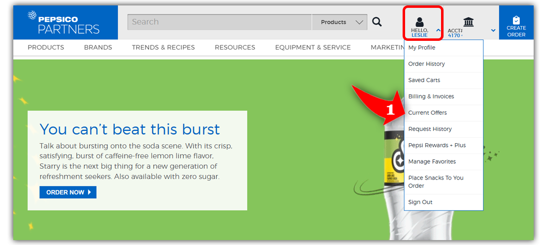 Login to your PepsiCo Partners account. Click on your name and select 'Current Offers' from your account menu dropdown